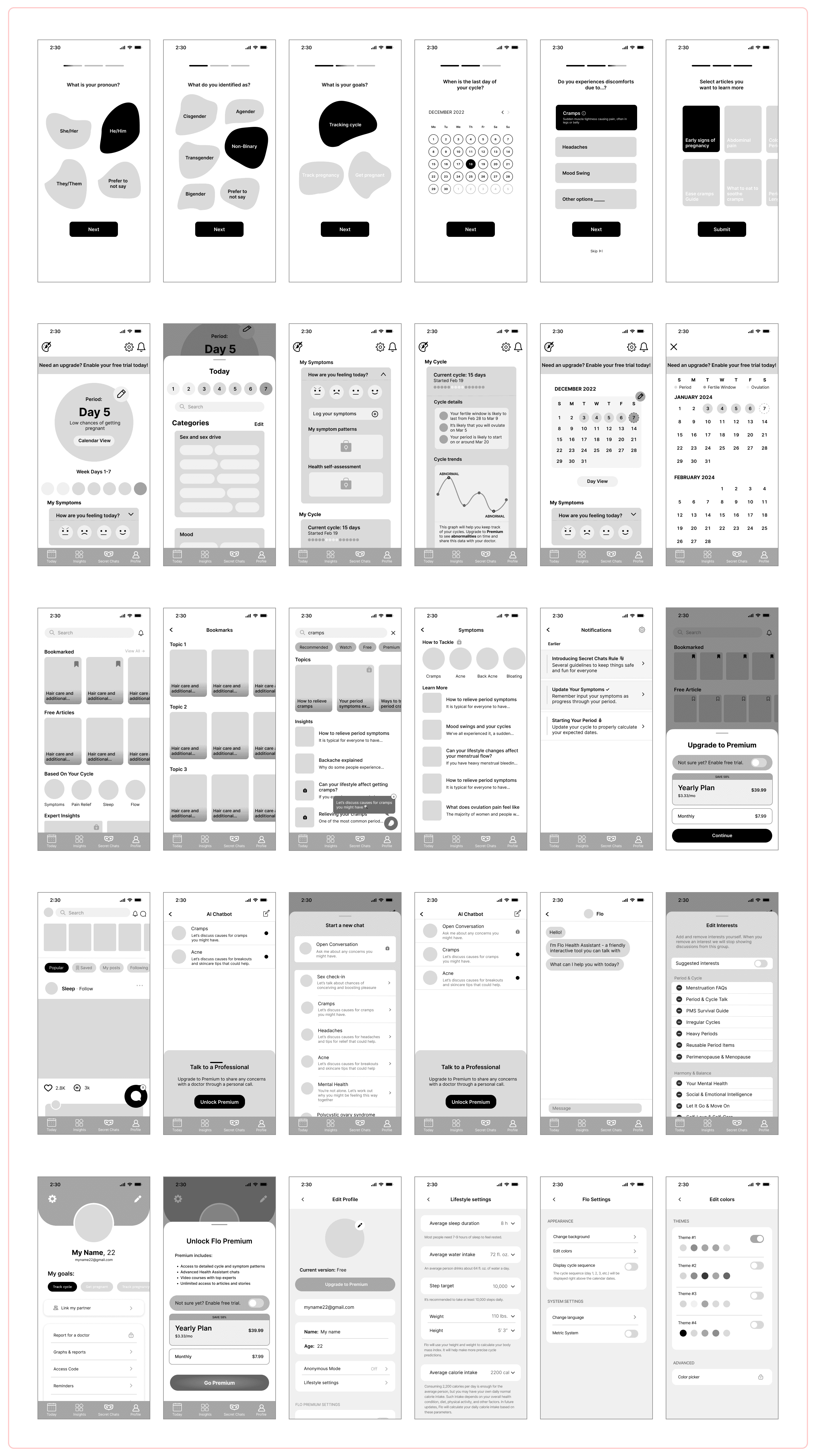 We conducted 12 user interviews and launched a survey around gender identify and inclusivity, usability, paywall, and privacy to gain a better understanding of users personal experiences with Flo. After gathering data, we identified a few common insights across our users.
