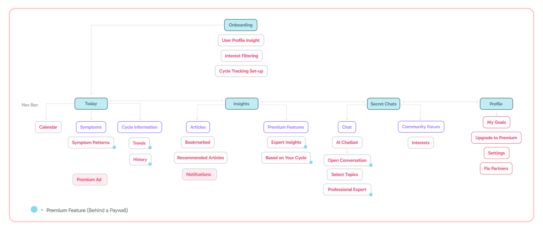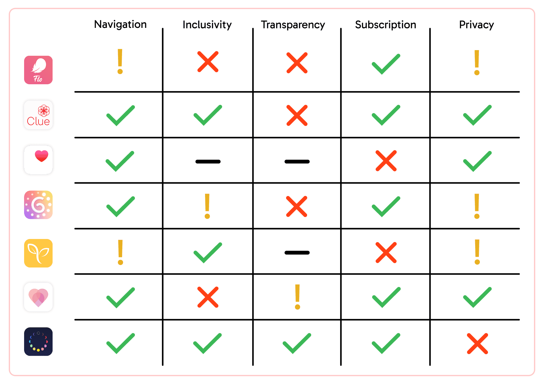 To better understand the UI of period-tracking apps, we conducted a competitive analysis of Clue, Apple Health, Glow, Ovia, Clover, and Stardust. Each app was evaluated on navigation, inclusivity, transparency, subscription/paywalls, and privacy. Our findings revealed notable differences: Clue, Ovia, and Stardust stood out for inclusivity, while Flo, Glow, and Clover fell short. Apple Health offered a more generic experience due to its minimal UI. Most subscription-based apps, aside from Stardust, lacked transparency around free versus paid features. Privacy was also a concern, as apps like Flo, Glow, Ovia, and Stardust have previously sold user data despite their stated privacy commitments.