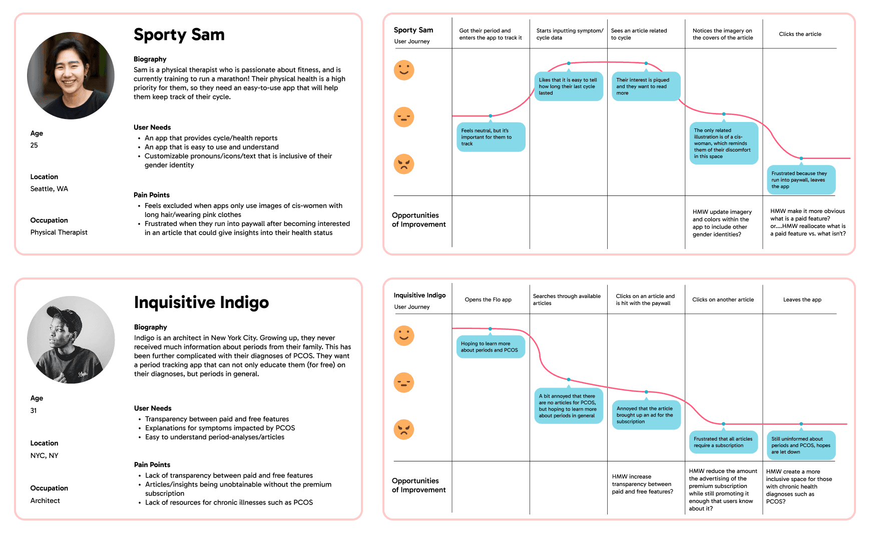 To deepen our insights, we developed two user personas that captured our target audience’s needs and pain points. We then mapped their user journeys to visualize the end-to-end experience and identify opportunities for improvement through ‘how might we’ questions.